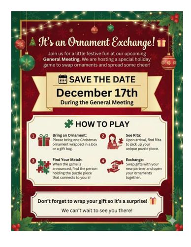 Dec 17th social Meeting 7 fishes dinner 6 PM bring an Ornament to Exchange